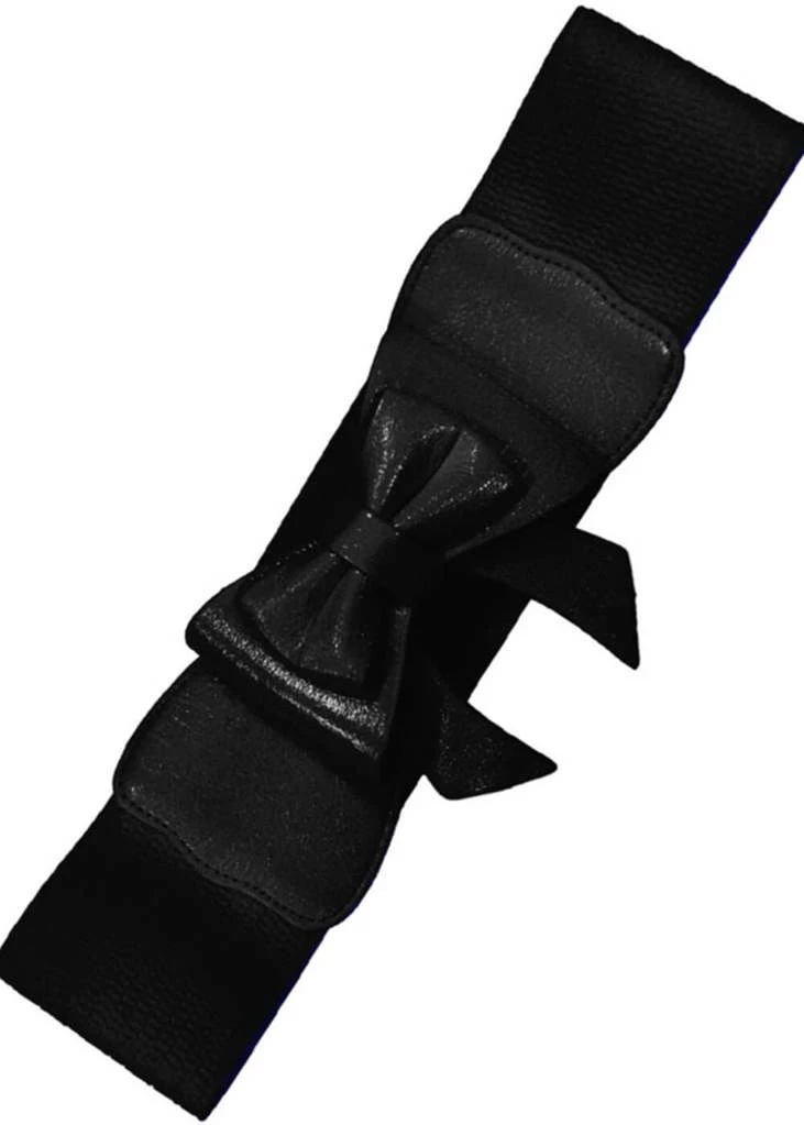 She closes with a hook and eye closure underneath the bow, and is adjustable to two sizes. The bow is made of a beautiful quality lacquer faux leather. Perfect for that lovely line, or a little extra sass for your look!