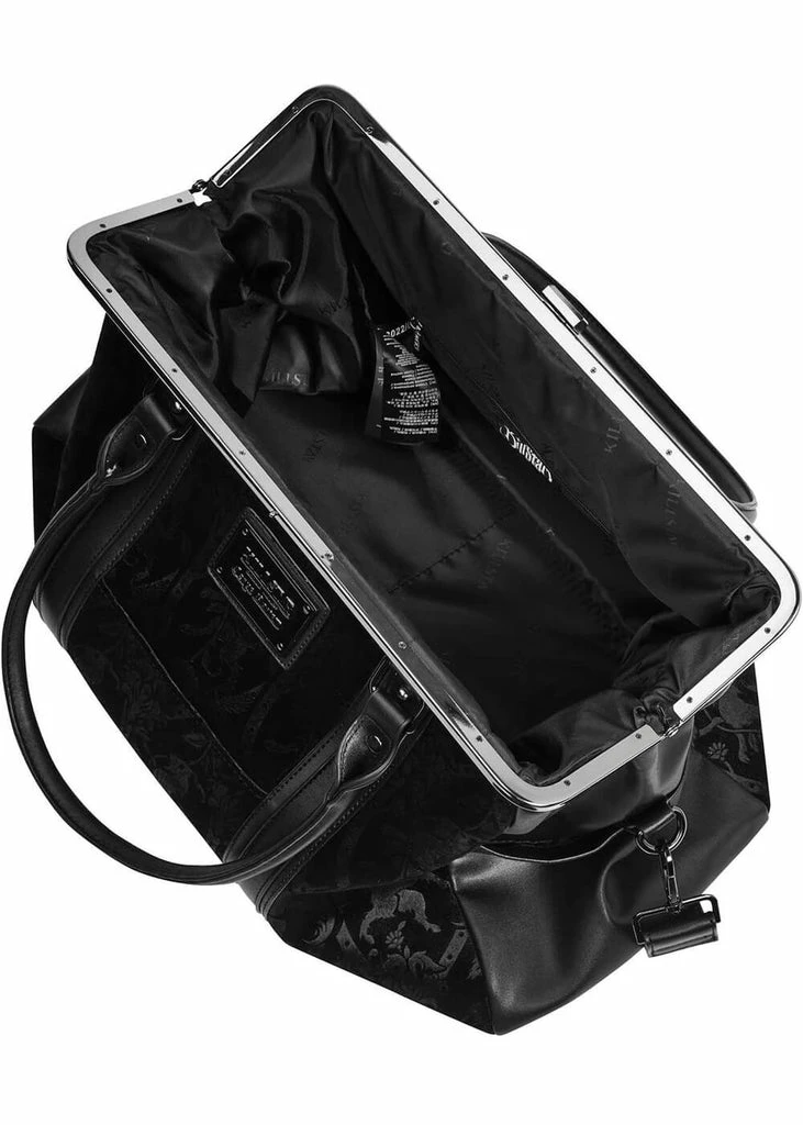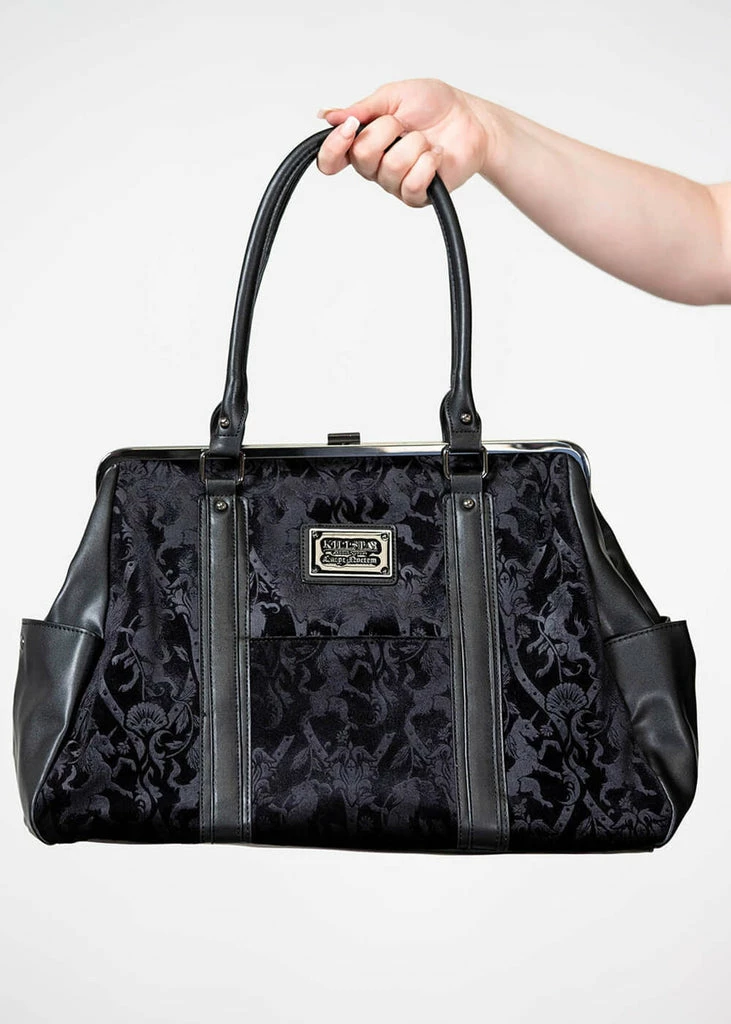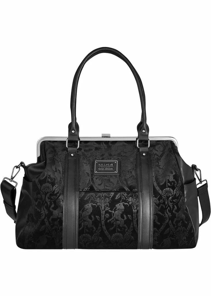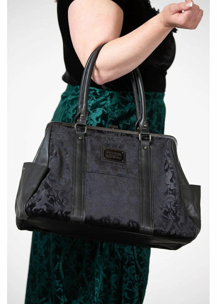 You carry her using the handles, that are also long enough to sweep them over your shoulder, or the detachable shoulder strap. She’s made of a high quality faux-leather that is covered in pitchblack velvet, decorated with faux-leather details. She is lined and has 2 open pockets and a zipper pocket on the inside. There is another zipper pocket on the back and additional open pockets on each side.