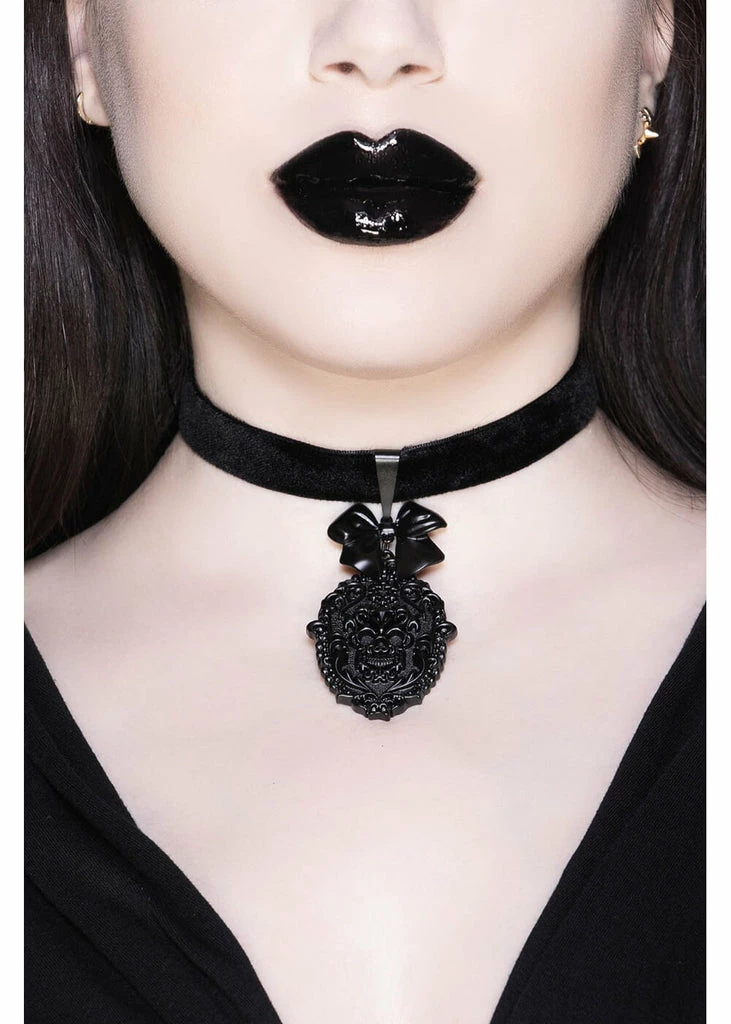 The black hanger is decadently adorned with ornaments, a bow and skull, elegant with a twist! The velvet choker is adjustable with the little extra bit in the back, so it always feels good around your neck.