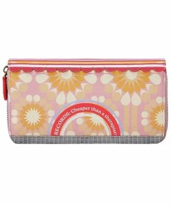 This wallet has room for 5 cards, a compartment for bills, no seperate space for zipper pocket for change, plus space for an ID or a picture. Her high quality faux-leather keeps its shape nicely and closes with a zipper all around.