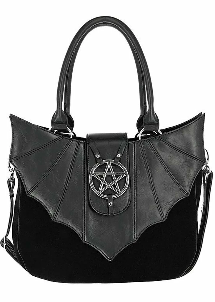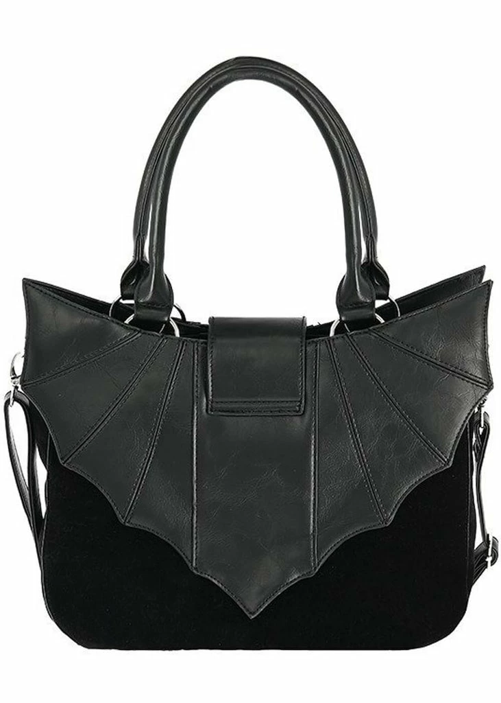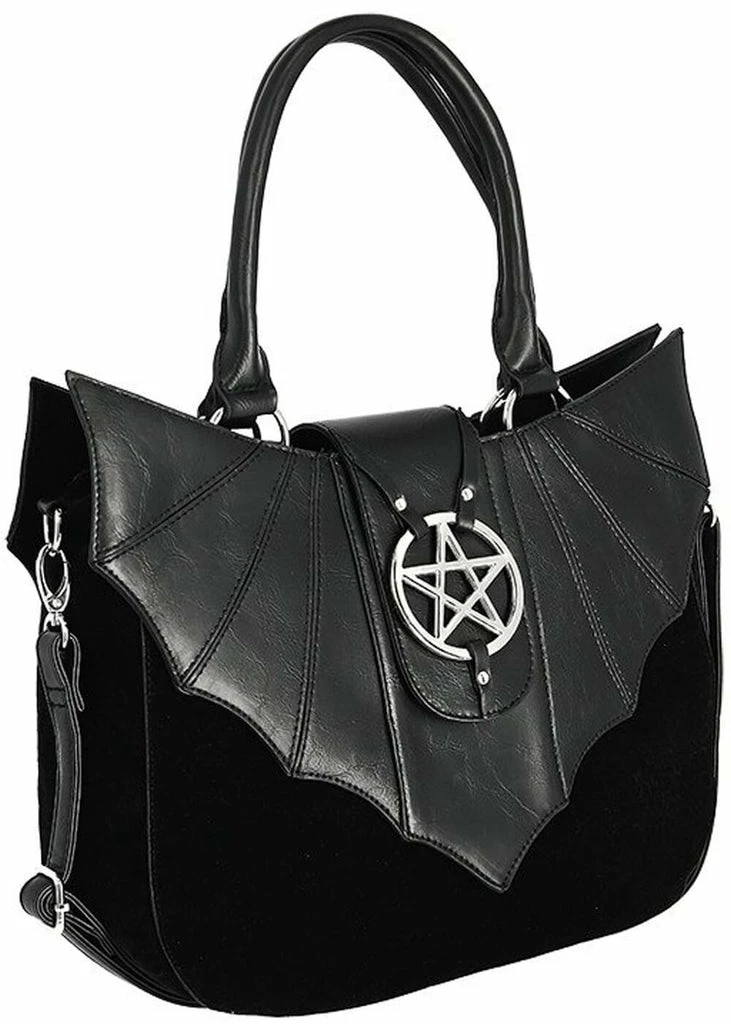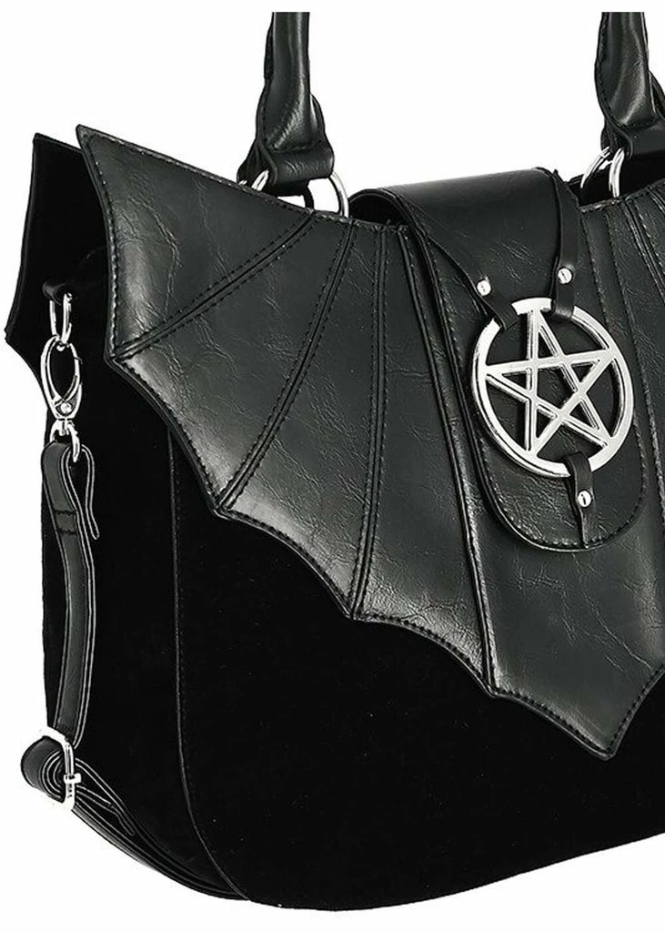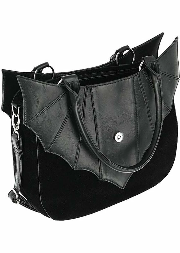 She is a dark beauty with wings in the shape of a bat! The faux leather stands out elegantly against the jet black velvet of the bag…