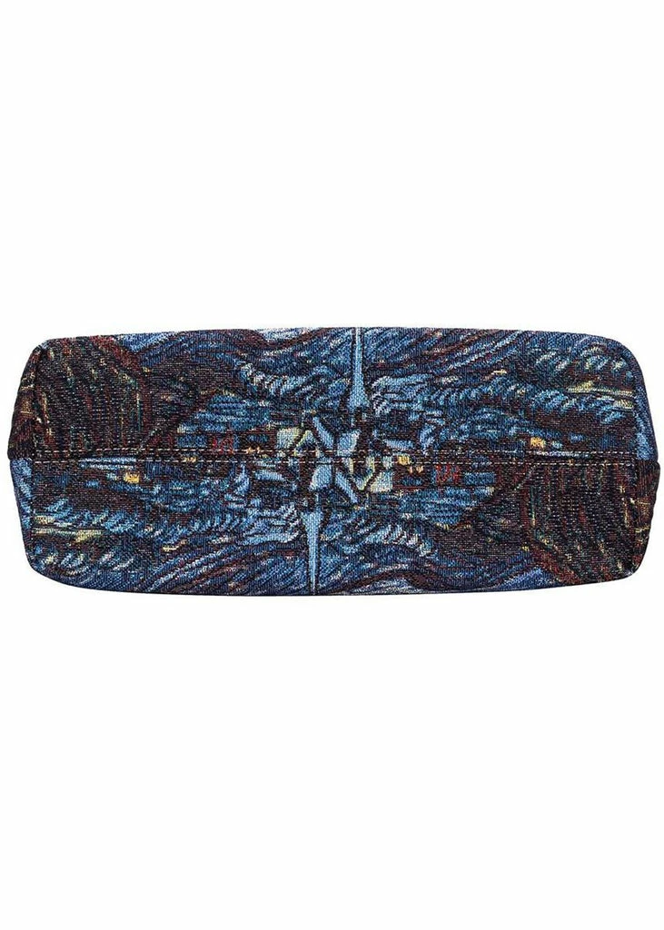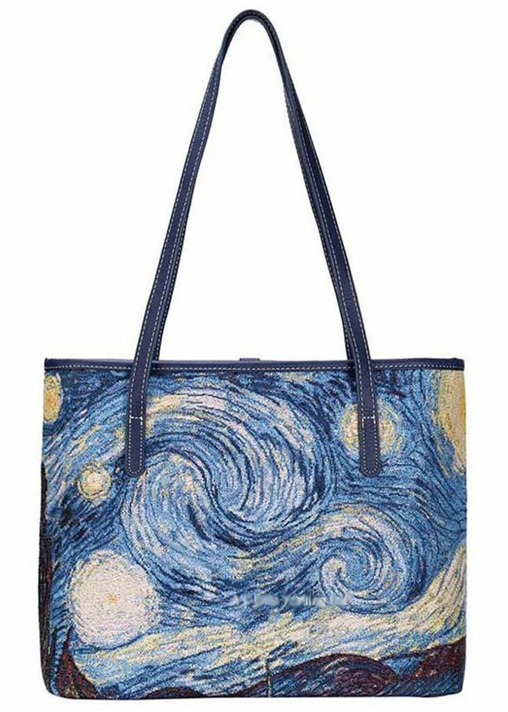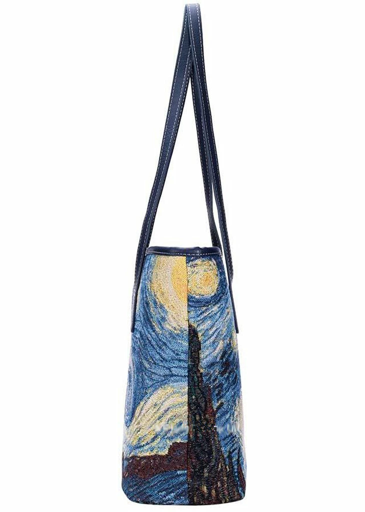 The outside is decorated with the iconic artwork ‘Starry Night’ by Vincent van Gogh on fabric. It closes with a zipper on the top, where it also has a decorative faux-leather edge.
