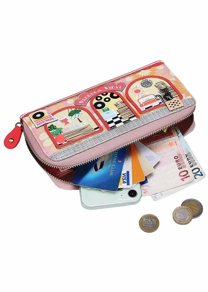 With her width of 19 cm, this beauty is nicely big, so the faux-leather details can really stand out. On the inside, she has 4 compartments that even fit a small phone and a key, a 1 zipper pocket for change and 2 compartments for bills. She also has room for 8 cards, and of course the iconic Vendula lining. Thanks to the zipper all around, everything is stored safely. The back is plain coloured vegan leather.