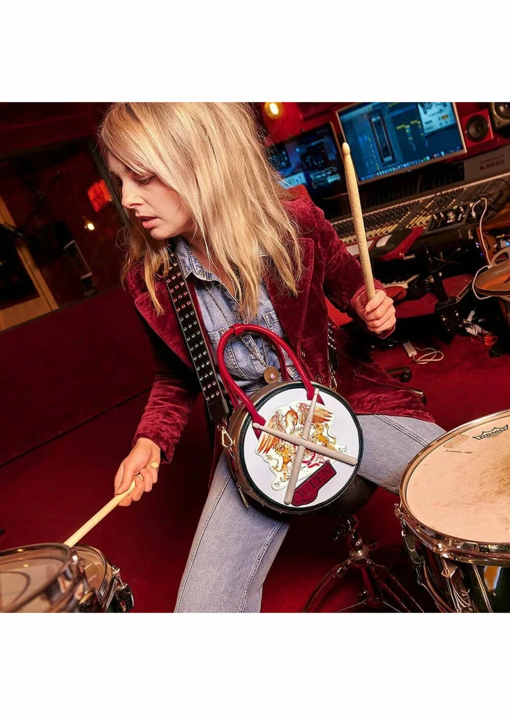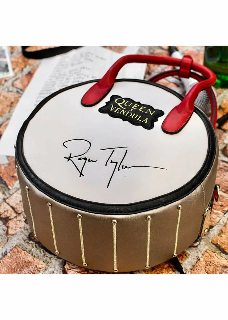 Could a bag be more Rock ‘n Roll than Roger Taylor’s drumkit? Complete with drumsticks(!), Queen crest and logo. On the back you find Roger’s autograph stitched by hand, and the bottom has stud feet, so you can put her down without having to worry.